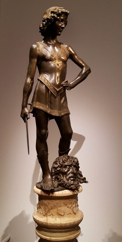 A testimonianza dell’eclettismo di Verrocchio ecco emergere in tutta la sua leggiadra bellezza il David vittorioso, opera in bronzo che l’artista realizzò fra il 1478 e il 1470 e con la quale rinnovò lo stereotipo dell’eroe biblico in una veste nuova, e che ebbe molta fortuna, diventando modello di riferimento per svariati artisti.