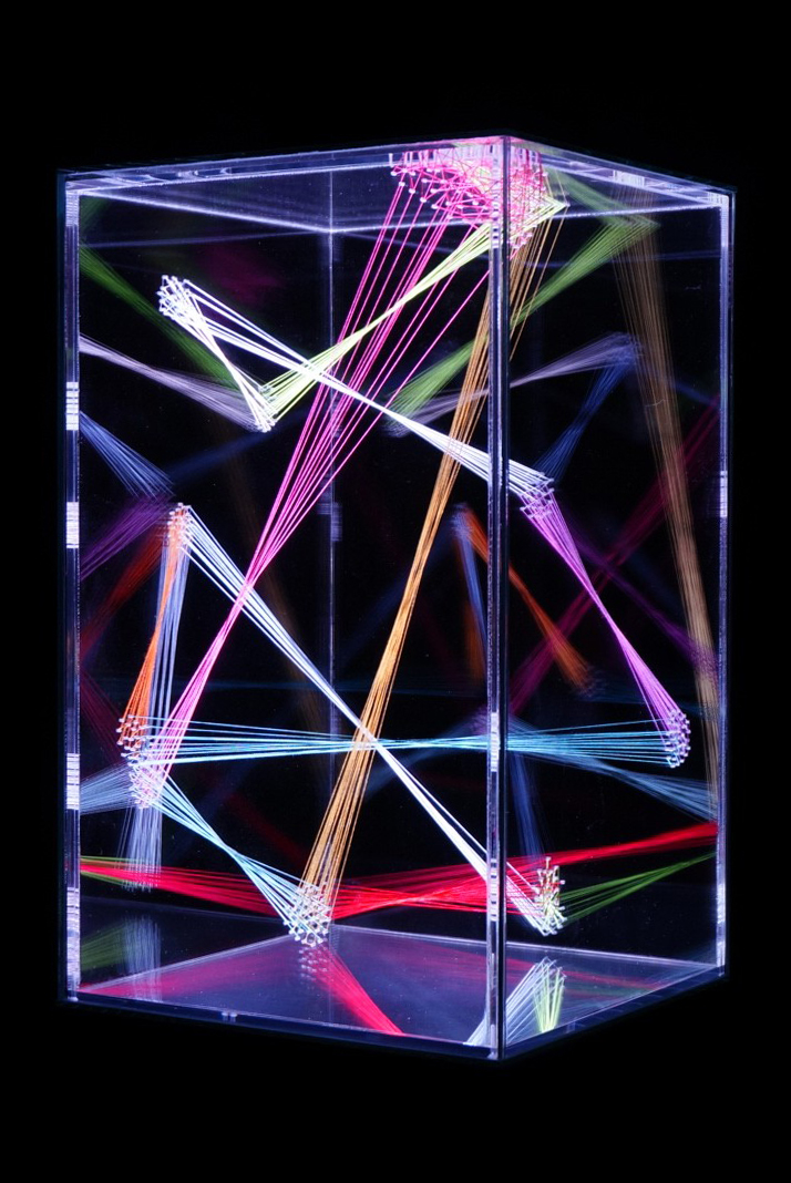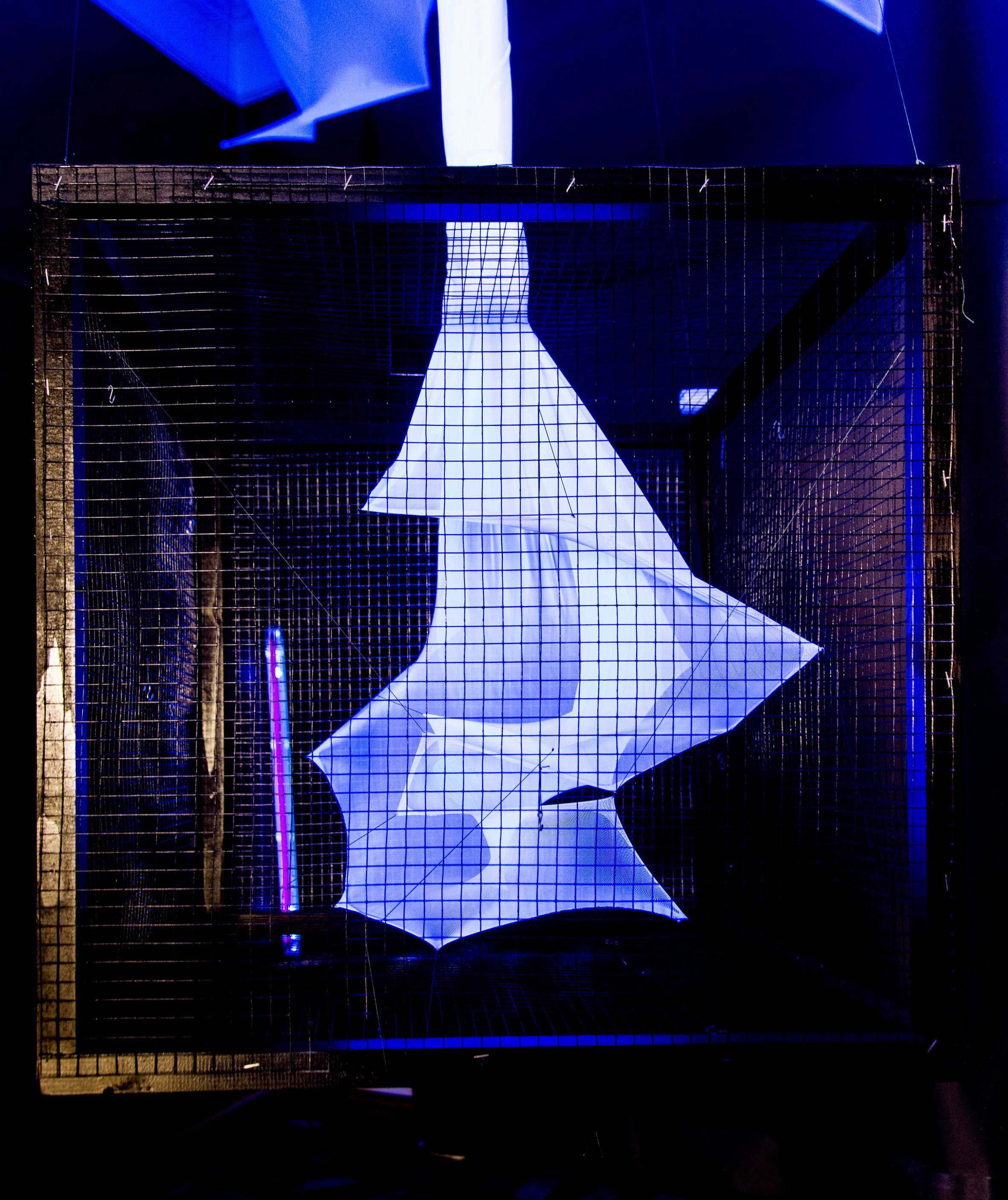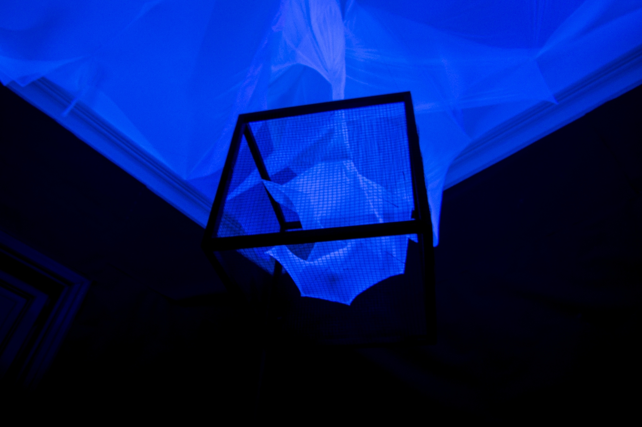 Le sue opere si compongono in reti colorate di lycra semitrasparente, tirate, adattandole allo spazio a sua disposizione. Tutte le opere infatti sono in netta correlazione con il luogo in cui vengono esposte. Due sono state pensate proprio per il Villino Pignatelli e sono le due di dimensioni più grandi, che invaderanno completamente le sale del palazzo neorinascimentale. Verso metà percorso la tensione si alza. Una stanza buia con un rumore fastidioso e una luce effetto flash, ci incoraggia ad andare a guardare la scultura a specchio più da vicino e…Come per magia, avvicinando l’occhio alla fessura, si ha l’impressione di distensione,di quiete. Continuiamo avanti e arriviamo ad una sala, quasi meditativa. Ci sono dei cuscini, ci stendiamo. E Poi l’ultima. L’installazione site specific. Quella, che l’artista, considera il massimo della liberazione emotiva e che fa ci fa entrare a contatto con ilo nostro profondo.