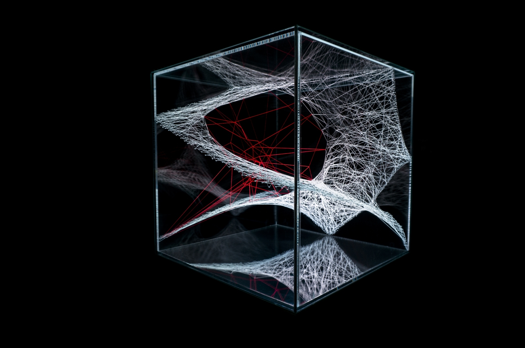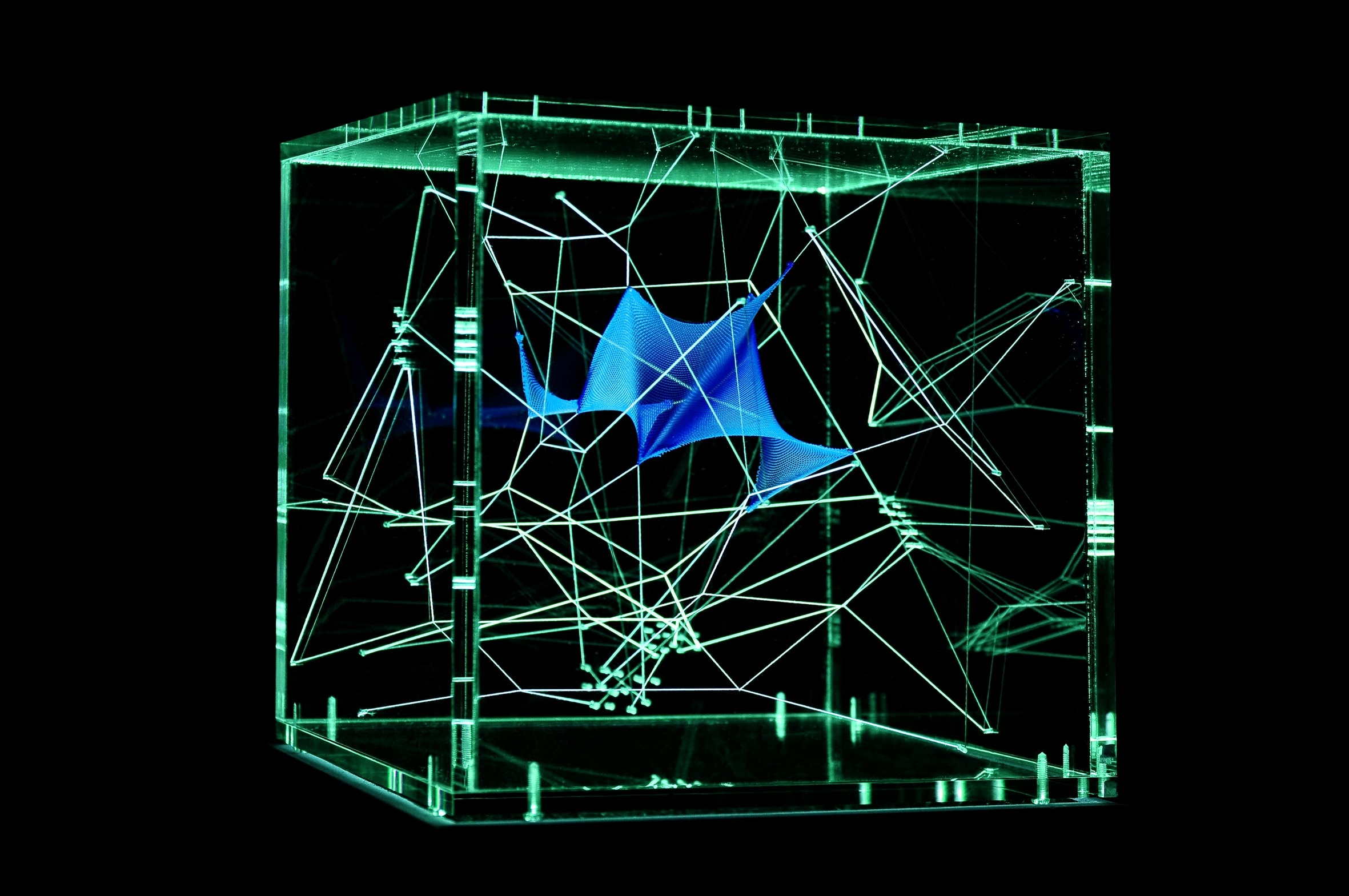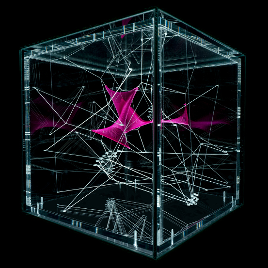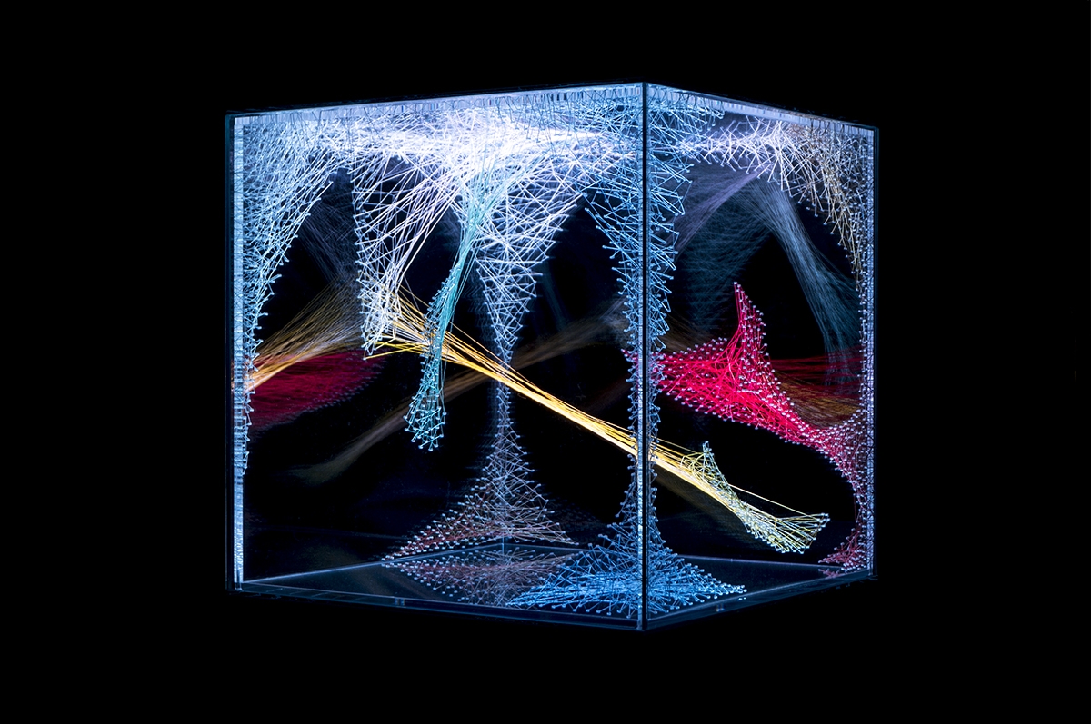 Le sue opere si compongono in reti colorate di lycra semitrasparente, tirate, adattandole allo spazio a sua disposizione. Tutte le opere infatti sono in netta correlazione con il luogo in cui vengono esposte. Due sono state pensate proprio per il Villino Pignatelli e sono le due di dimensioni più grandi, che invaderanno completamente le sale del palazzo neorinascimentale. Verso metà percorso la tensione si alza. Una stanza buia con un rumore fastidioso e una luce effetto flash, ci incoraggia ad andare a guardare la scultura a specchio più da vicino e…Come per magia, avvicinando l’occhio alla fessura, si ha l’impressione di distensione,di quiete. Continuiamo avanti e arriviamo ad una sala, quasi meditativa. Ci sono dei cuscini, ci stendiamo. E Poi l’ultima. L’installazione site specific. Quella, che l’artista, considera il massimo della liberazione emotiva e che fa ci fa entrare a contatto con ilo nostro profondo.