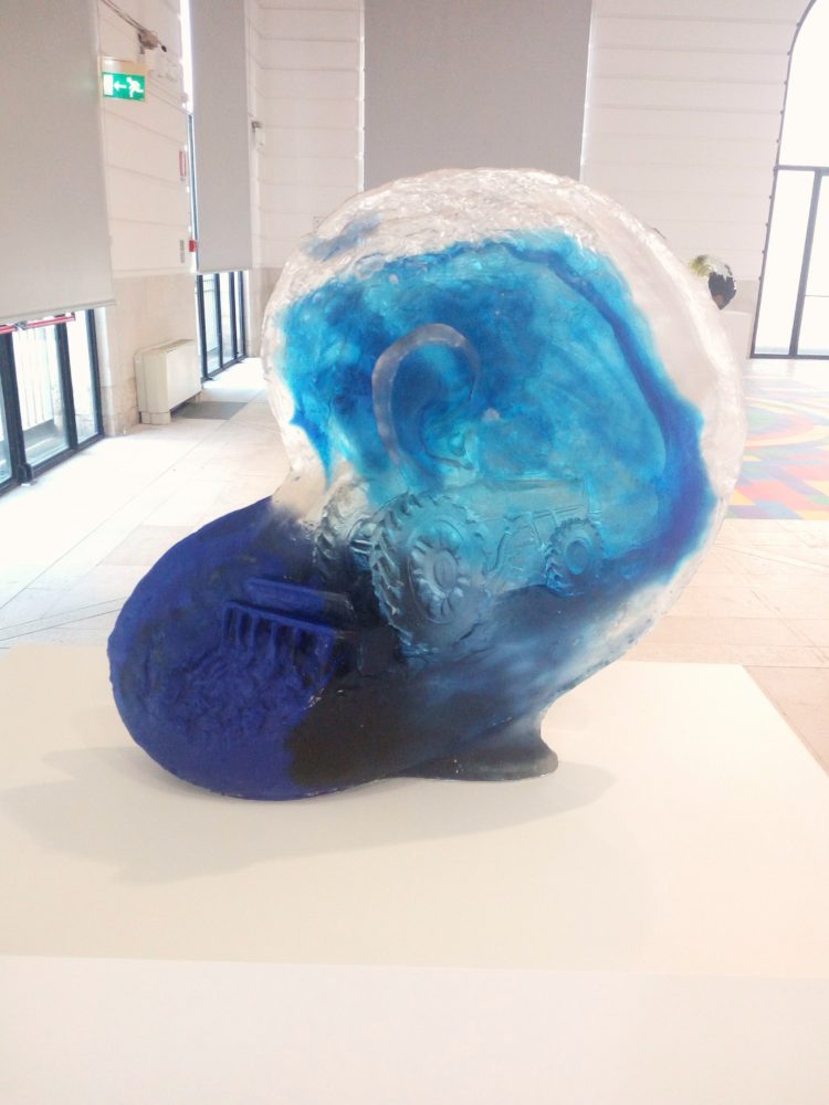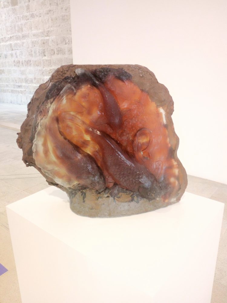 La densità del vetro sostanza prediletta da Perrone è ambivalente. Il materiale è difatti fluido e solido nelle fasi del lavoro. Pertanto si ritrovano liquidità e consistenza come nelle acque rappresentate dall’artista. Per generare le opere, il vetro è fuso con minerali e ossidi che creano magnifiche cromie e sfaccettature. Successivamente è versato in calchi di gesso, infornato ad altissime temperature; di seguito riposa gradatamente per sei settimane. Il vetro deve asciugare in tempi dilatati per evitare che si incrini. Parimenti alla lentezza che caratterizza le attività umane presenti nelle sculture: l’artigianato delle anfore e i trattori per l’esperienza del lavoro dei campi. La graduale stagionalità dei prodotti della terra e della riproduzione dei pesci. Così come in natura interminabili processi hanno permesso la creazione e l’evoluzione delle specie.