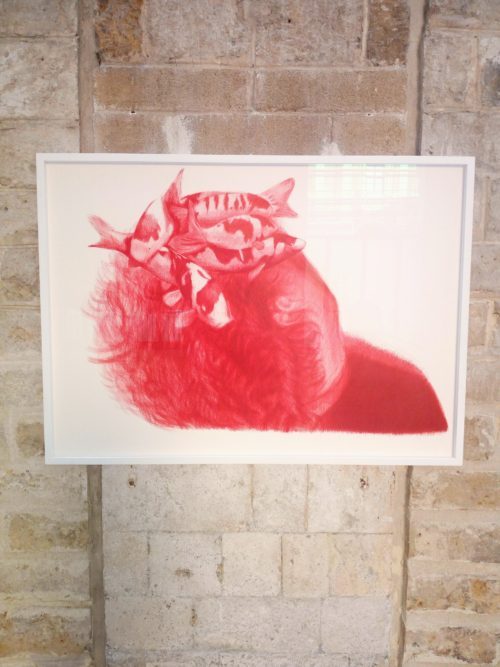 Il colore sanguigno, rude ed il tratto affilato ed energico dei disegni realizzati con una semplice biro rossa.