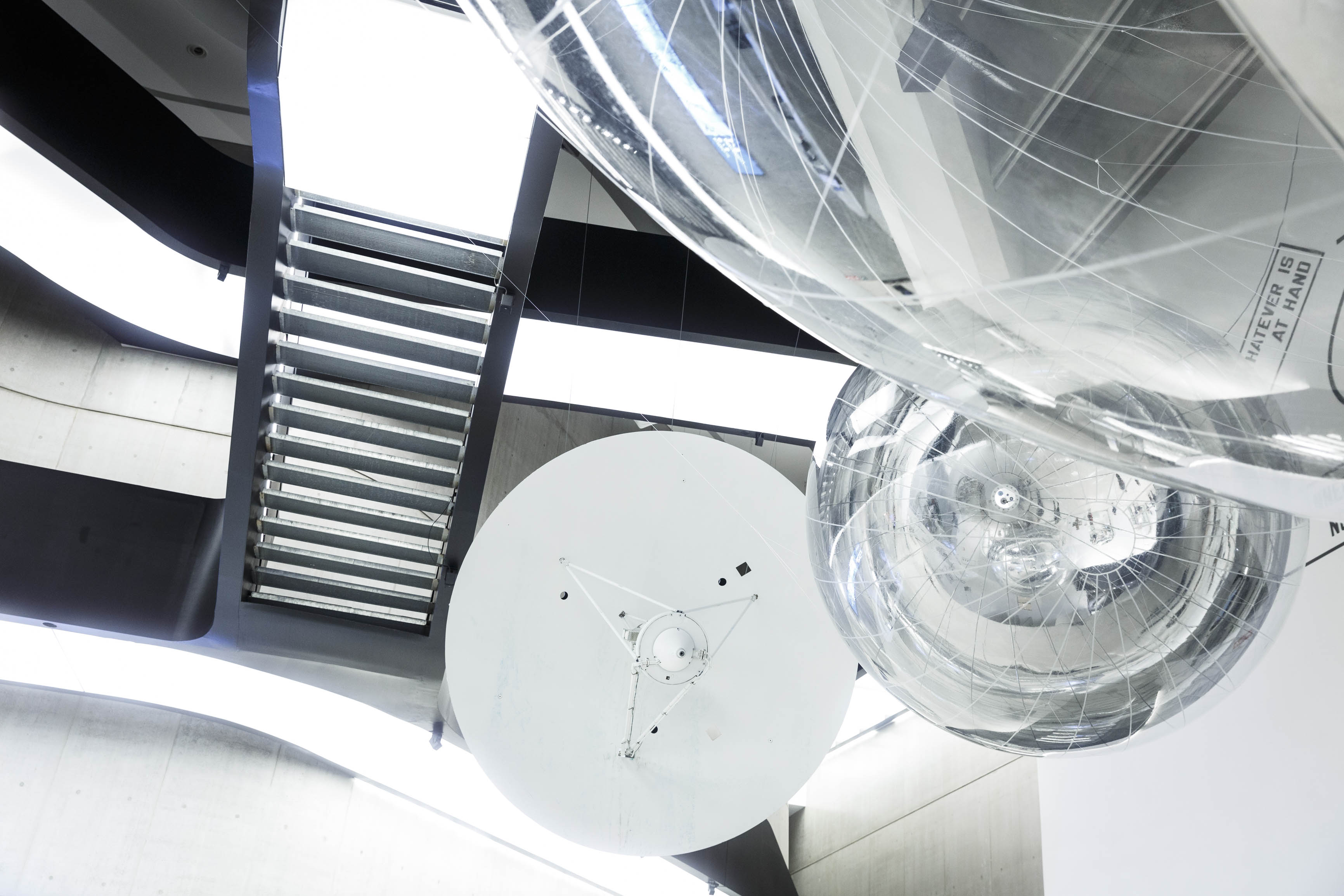 A guardare la Sonda Cassini vi è “Aeroke”, l’installazione di Thomas Saraceno che con grande maestria fa delle sfere molto chiare e luminose in grado di captare suoni impercettibili dispersi nell’atmosfera.
