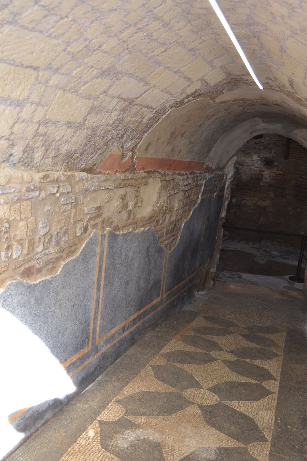 Le vie di accesso erano due: la prima è quella attualmente fruibile, la quale fungeva forse da collegamento con un giardino esterno, con pavimento a mosaico in tessere bianche e nere con forme geometriche e pareti intonacate a finto marmo. La volta è decorata con foglie e grappoli d’uva, eroti ed uccelli. Entrando, a sinistra, troviamo la seconda via d’accesso, utilizzata forse come collegamento di servizio con la villa.