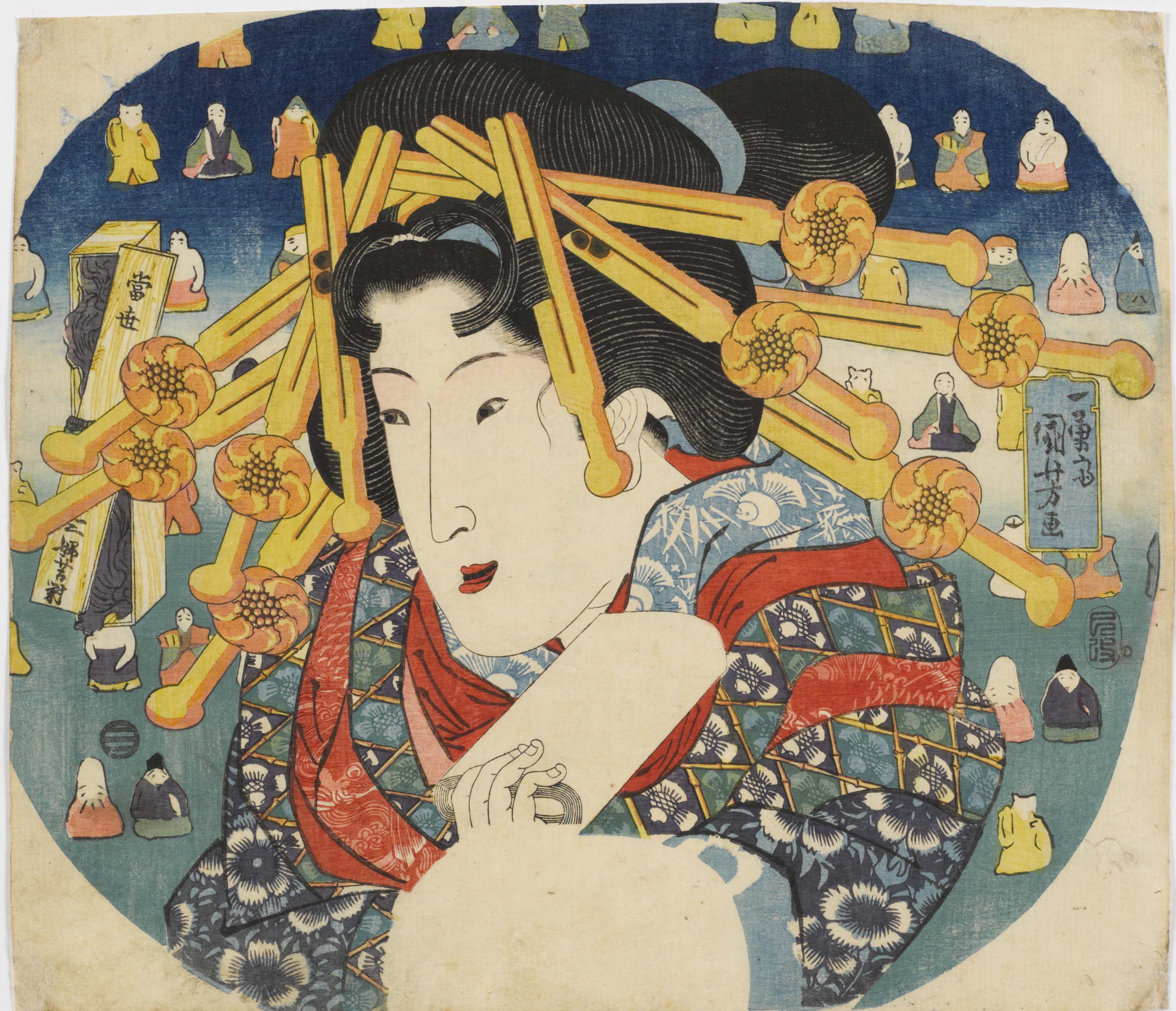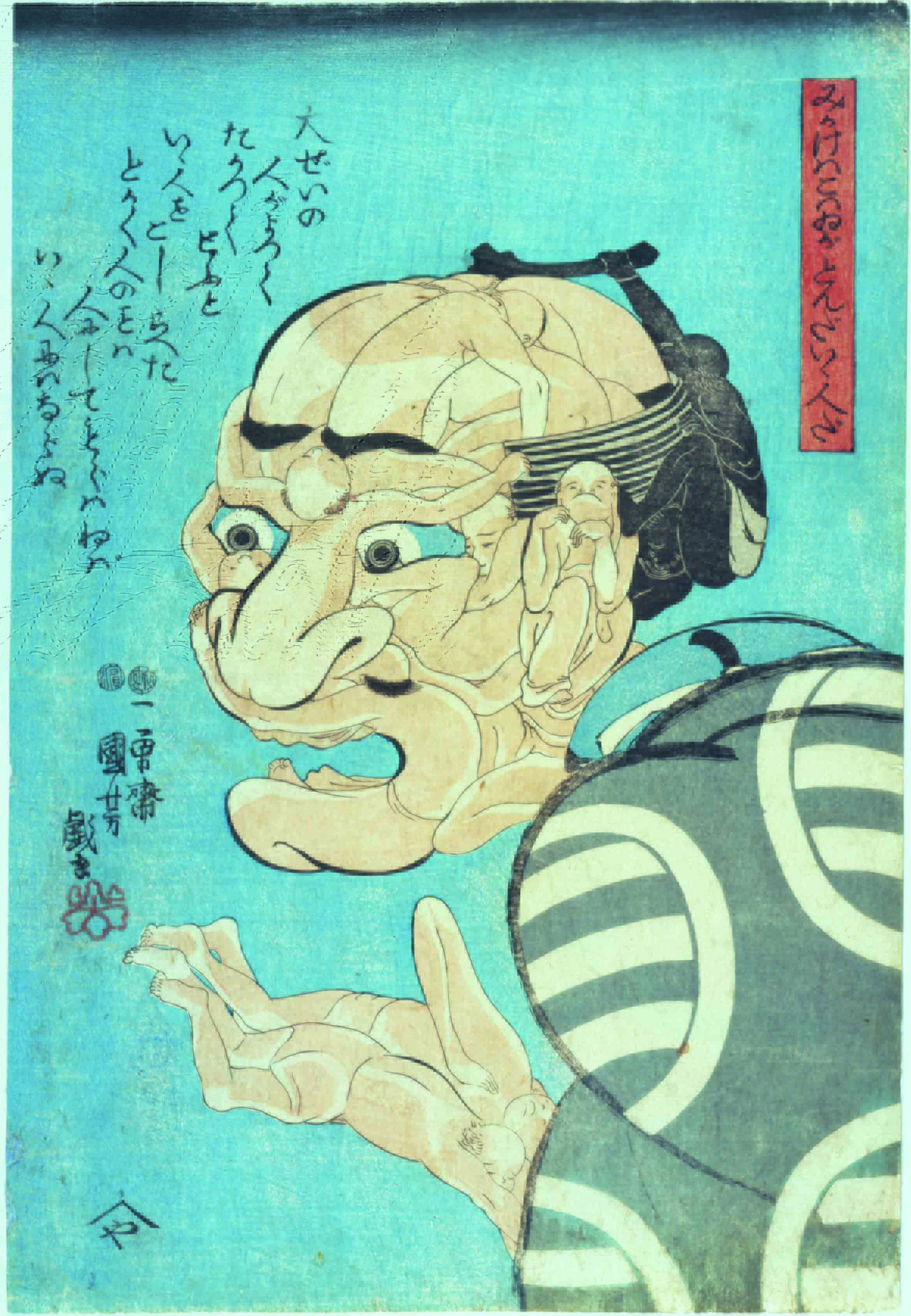 Kuniyoshi è famoso anche per i suoi giochi illusionistici, fatti di ombre e di figure composite alla maniera di Arcimboldo (l’artista fu chiamato anche “l’Arcimboldo del Giappone”), ovvero figure inserite in altre figure, e parodie di storie e battaglie con protagonisti animali, oggetti, dolci, cibi.