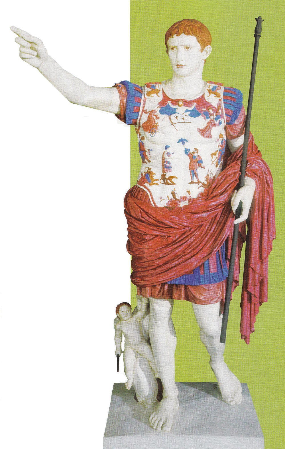 Attraverso le parole del Prof. La Rocca abbiamo avuto la conferma che le fonti antiche non hanno lasciato dubbi al riguardo: le statue erano colorate e lo erano anche le architetture. Nelle costruzioni principali vi era un tripudio di marmi, stucchi, oro e pitture dotate di colori caldi e sfumati. Era dipinta la Colonna Traiana, per rendere più visibile il continuo e meraviglioso bassorilievo, uno dei capolavori dell’arte antica, narrante la conquista della Dacia promossa da Traiano. Era dipinto il celebre Augusto di Prima Porta dei Musei Vaticani, che possiamo vedere qui sotto com’era originariamente (seppur ci sono ancora delle lacune riguardanti se fosse colorito o no anche l’incarnato) e come lo vediamo oggi.