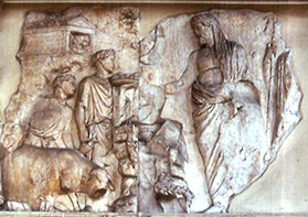 [Foto di RomanoImpero (Copertina), di Archeo Gennaio 2005 e www.abctribe.it (rispettivamente Augusto di Prima Porta colorato ed originale), di Manfred Heyne (Ara Pacis), di Giulia Grassi (Enea che sacrifica la scrofa bianca ai Penati originale e dipinto) e GMT (piante dipinte)]
