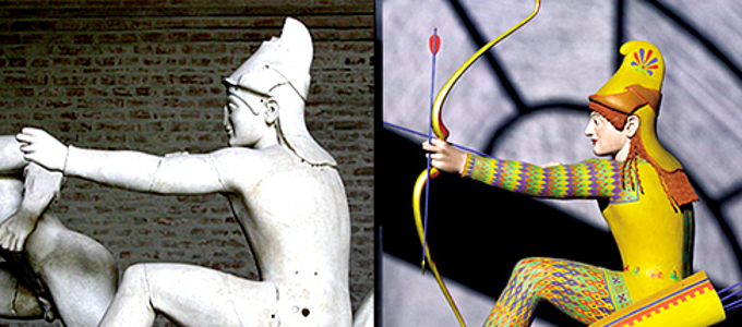 Già nel XIX secolo furono fatti degli studi riguardanti il colorismo nell’arte antica. Sappiamo che erano colorate le statue che decoravano i frontoni del Tempio di Atena Aphaia ad Egina, ora conservate nella Gliptoteca di Monaco e restaurate da Bertel Thorvaldsen, come questo arciere: