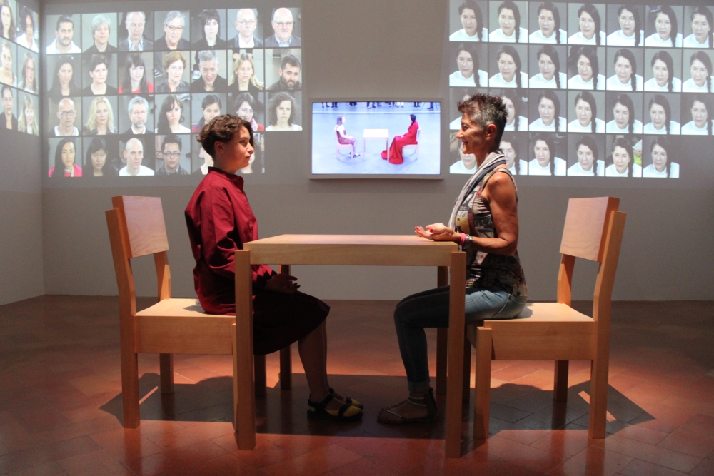 È in questo periodo che inizia a ragionare proprio sull’importanza della durata, facendo sì che la performance diventi vita, nasce l’opera The House with the Ocean View. Nella sala Participation il fruitore è invitato a sedersi, a mettersi le cuffie e a contare del riso, un esercizio meditativo che allontana dal tempo e dalla fretta, che ricorda l’importanza di una dimensione dove semplicemente si esiste, si respira e ci si libera completamente. Vi è inoltre la possibilità di aprire (letteralmente) i cassetti della vita di Marina, un’attenta selezione che lei stessa ha fatto per raccontarsi a tutti noi. Il viaggio si chiude con l’opera The Artist is Present proiettata su tre pareti, al centro due sedie vuote che attendono chi ha il coraggio di mostrarsi nella sua nuda verità di essere umano frangibile.