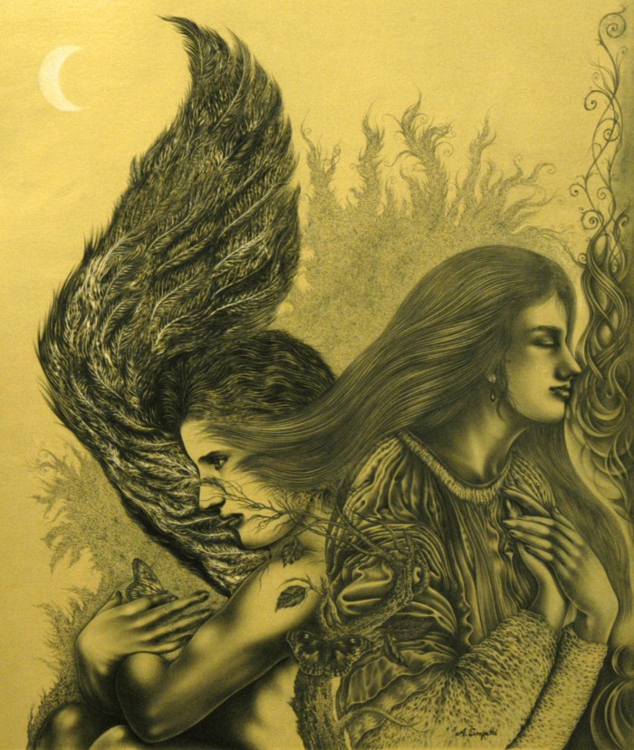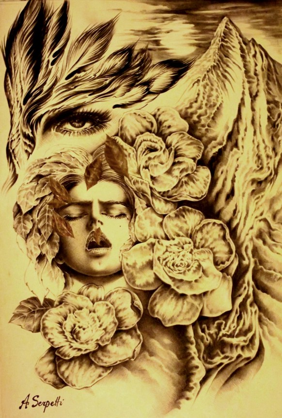 Non ha velleità da pioniere: nulla di totalmente nuovo o sperimentale prende spazio nei suoi lavori. La tecnica del carboncino o quella incisoria dell’acquaforte gli permette infatti di oscillare con eleganza fra il classico e l’allegorico: Alessio Serpetti si rifugia in tecniche antiche padroneggiate con cura e garbo, e in soggetti ancestrali appartenenti a un mondo lontano nel tempo, a un mondo che vive nei sogni. Nelle sue opere Serpetti non fa mai riferimento ad accadimenti storici coevi, ma illustrando un mondo onirico in bianco e nero esce fuori dal tempo, proiettandosi in una realtà trascendente. Una realtà fatta di sogni.