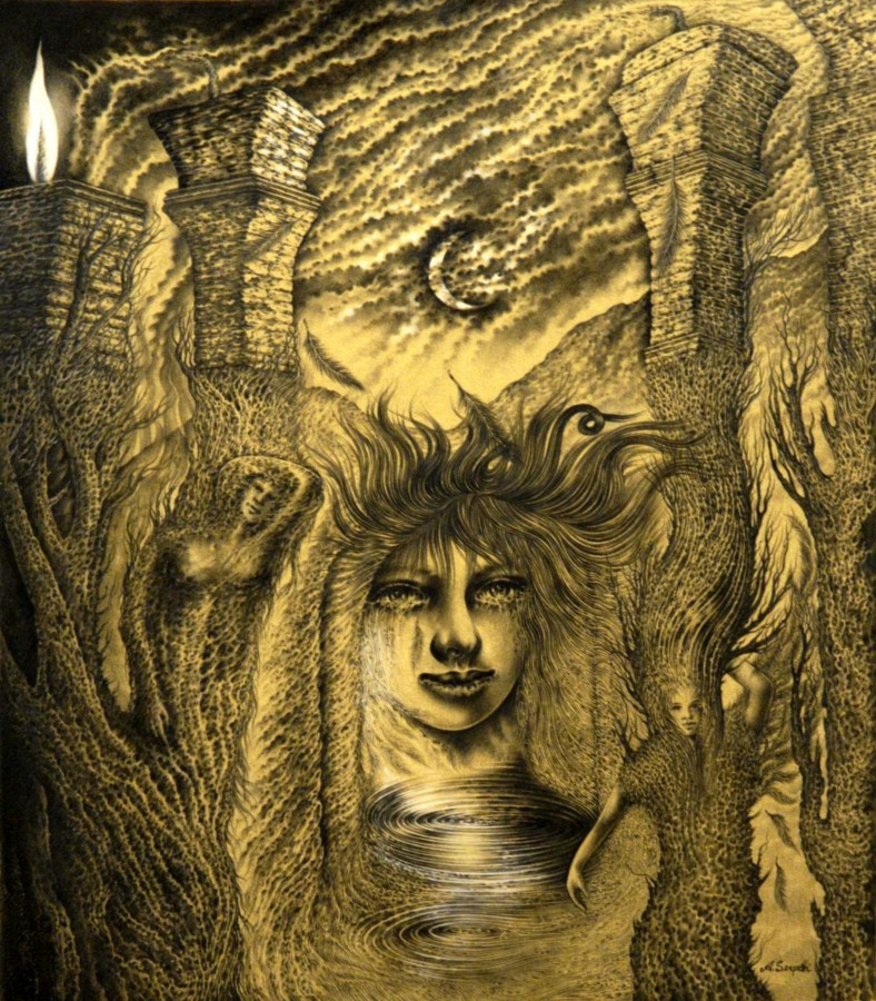 Eclissi misterica ci mostra ancora figure umane che alla luce della luna trasformano i loro corpi di carne in tronchi, rami e radici sempre accompagnati da rovine architettoniche sullo sfondo.