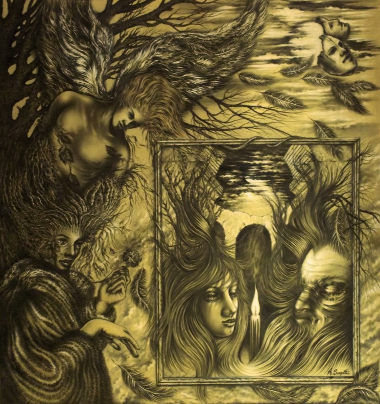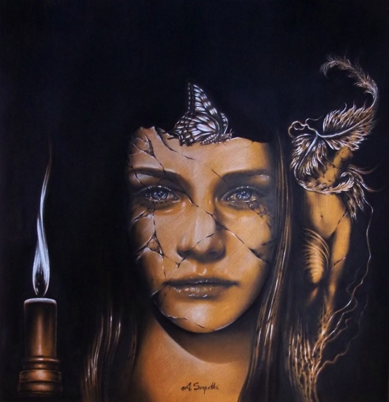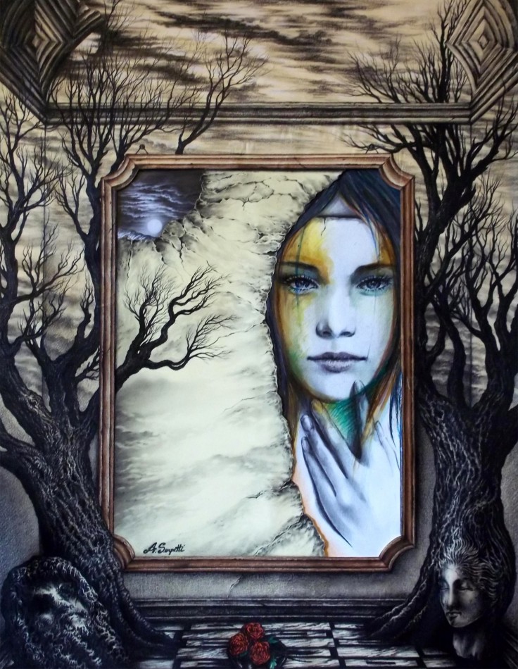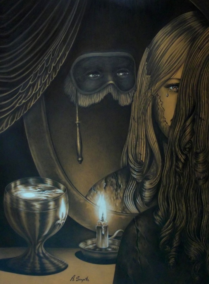 Notti illuminate dalla luna, donne misteriose e sofferenti, candele, specchi, sguardi negati, maschere. Questi sono i soggetti che Alessio Serpetti predilige per le sue opere. Immagini che per l’artista avranno simbolicamente valore, ma il cui contenuto all’osservatore non arriva. Probabilmente perché non è un contenuto narrabile che Alessio Serpetti ricerca. Queste visioni sono a metà fra la metafisica e il surrealismo, ambientate in un luogo lontano, in un tempo che non è oggi, ma potrebbe essere ieri così come domani. Illustrano situazioni che vivono solo nell’immaginazione e nel sogno, dove tutto è lasciato in sospeso e attende di essere rivelato. Sono sogni tormentati dai quali bisogna svegliarsi per non cadere nell’angoscia. Serpetti ha talento nel convogliare gli insegnamenti di De Chirico, Gustave Moreau, i preraffaelliti e i surrealisti.