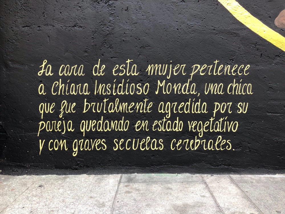 Chiara viene dipinta al culmine del potenziale femminile, incinta, come simbolo della sua rinascita. Toni Espinar vede in quest’opera una donna sola, come tante altre vittime di violenza, chiusa in un cerchio come in una placenta che sta per farla rinascere. Posto in una strada trafficata, su una parete adiacente al centro ricreativo per anziani, il murale esprime calma e protezione, ricordando ai passanti la vera forza femminile. Forza ricordata anche Maurizio, il papà di Chiara, che vede in questo ritratto una donna “che si è aggrappata alla vita in tutti i modi, come forse un uomo non avrebbe saputo fare”.