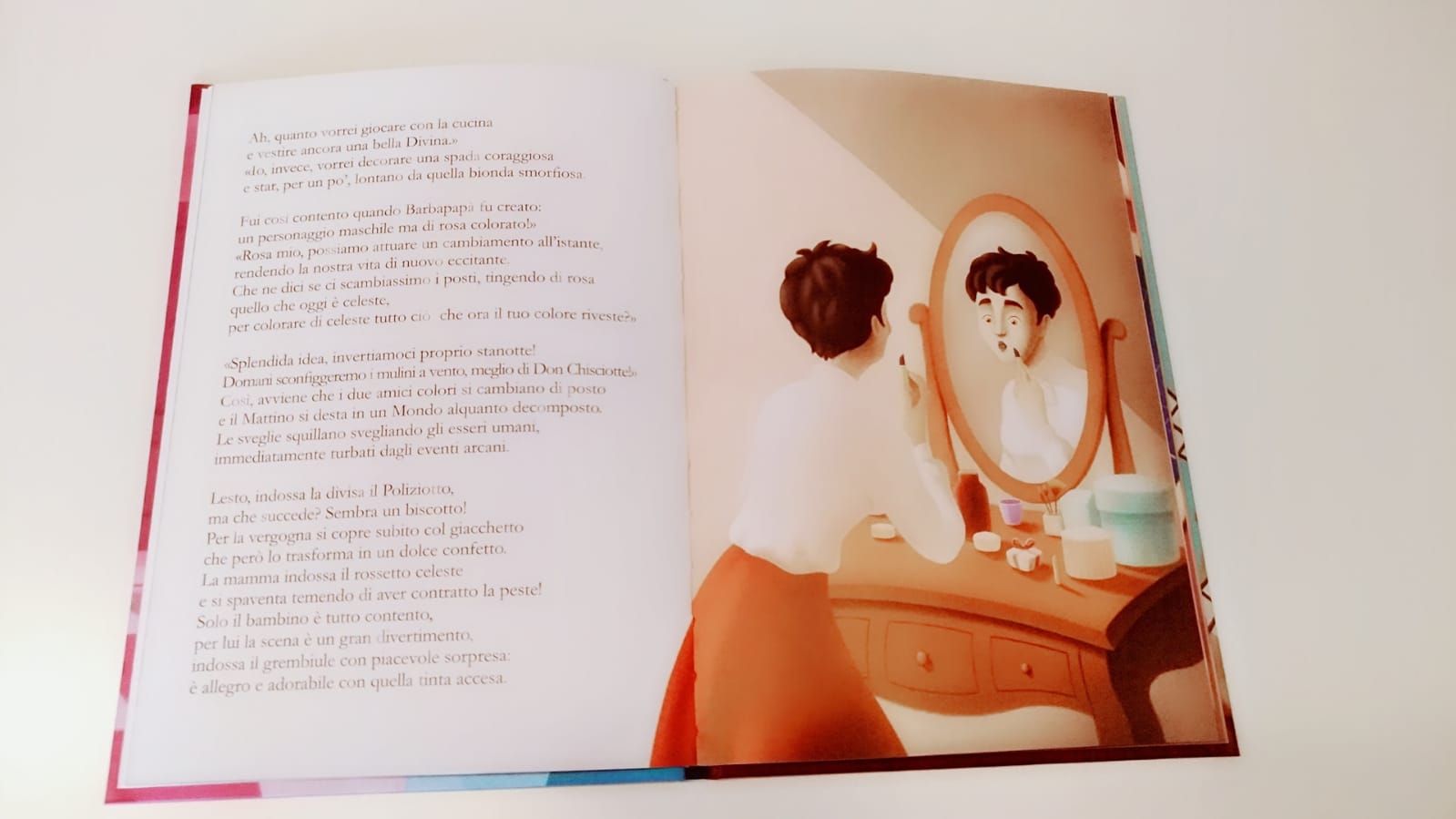 E decidono, così, di scambiarsi i ruoli mandando in tilt tutto il mondo. Una fiaba che fa riflettere, e molto. Il tema della diversità di genere raccontata in modo semplice e spiritoso, ma non banale. Ma ci può leggere un po’ tutto dentro, come la necessità impellente che i nostri figli seguano le proprie inclinazioni, senza per questo essere giudicati o fatti sentire diversi. Si parla di colori sì, come si parla anche di razza, genere, religione. Un messaggio importantissimo e bellissimo: che non ci siano più le odiose distinzioni terreno fertile per quelle discriminazioni odiose che corrodono l’anima di ancora tante, troppe persone.