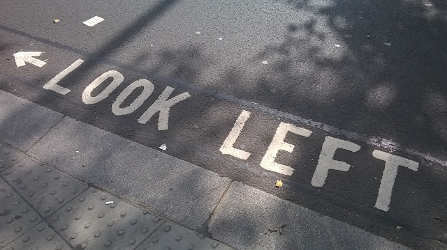 La guida “a rovescio” anglosassone disorienta praticamente tutti gli stranieri nell’attraversamento della strada. Per questo gli inglesi, così formalmente e fastidiosamente gentili, si sono attrezzati offrendo indicazioni scritte ai semafori. E’ inevitabile, vedendo queste direttive sull’asfalto, pensare che qualche sbadato sia rimasto vittima dei sensi contrari…