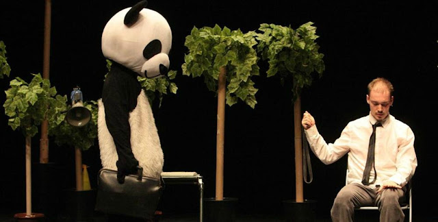 Perché se di punto in bianco appare un palloncino ad elio a forma di squalo e poi spunta un panda e poi si scopre inaspettatamente che il panda è coprotagonista (meglio antagonista, oppure alter ego?) dell’intero spettacolo, certo ci si aspetta di tutto, ci si sente pronti a tutto. Si è pronti ad assistere al panda che innaffia le proprie piante, si crea il proprio Natale con qualche spruzzata di neve qua e là, a ritmi che nascono da qualsiasi oggetto in scena. Eppure poi l’insonne sonnambulo viene trascinato nell’assurda condizione di un cane in una cuccia, che nel momento di ribellione alla sottomissione riappare in gonna e tacchi a spillo. Ma tranquilli, non ha certo abbandonato la sua maschera animalesca.No, non si è mai pronti a tutto quello che accade all’interno di questo sogno, incubo, mondo immaginario ribaltato nella realtà. All’interno di questa realtà che ha scavalcato qualsiasi confine con l’immaginario, inglobato il virtuale nel reale. Per quanto ci si possa opporre, la confusione è inevitabile, non se ne esce illesi. La vittoria su questo mondo irrazionale non è altro che la propria sconfitta stessa.