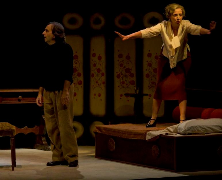 Tra i due personaggi in scena si instaura così un teso duello, condotto mediante uno scambio ininterrotto di ricatti e ritorsioni, di menzogne e affabulazioni, in una cornice scenica apparentemente dall’aria domestica e rassicurante – firmata insieme ai costumi da Red Bodò – che però, nell’offrire un perimetro ben preciso ai fantasmi mentali dei protagonisti, finisce per assumere i toni e le suggestioni di un realismo allucinato. In questo microcosmo dai confini continuamente invocati e negati, madre e figlio si inseguono, si cercano e si respingono saccheggiando presente, passato e futuro, in una incalzante altalena di emozioni che hanno nel grottesco la tonalità dominante.