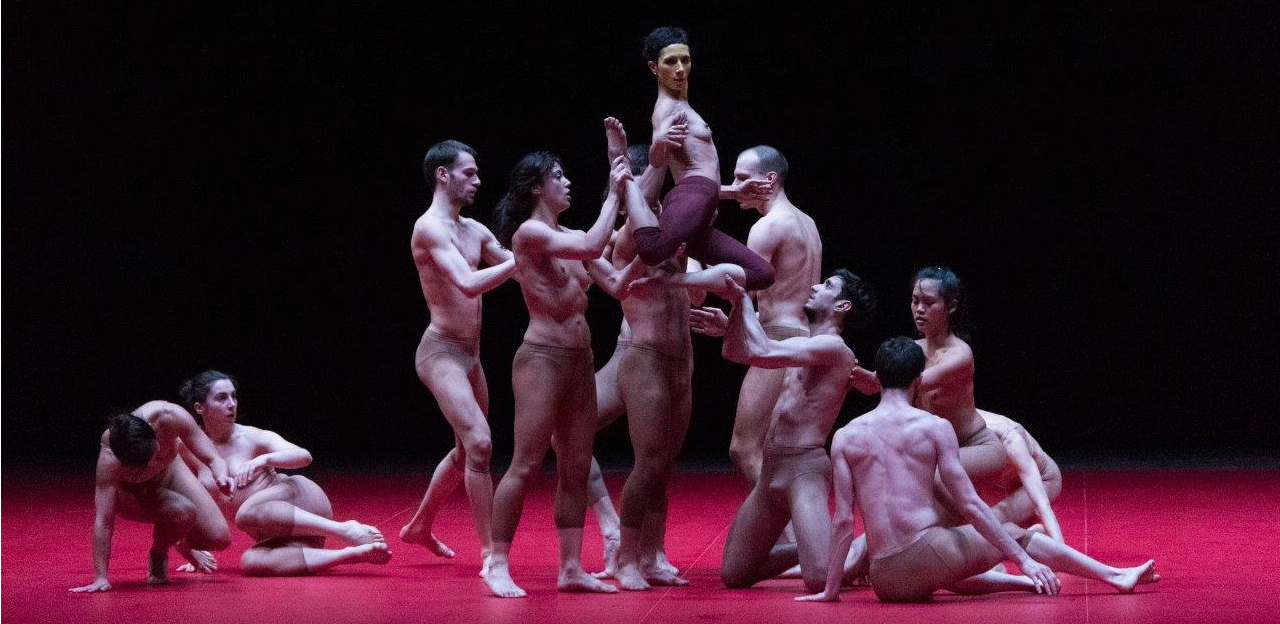 Una lunga pausa divide questa prima parte da quella effettivamente dedicata alla Sagra della primavera di Igor Stravinskij, che vede in scena 12 danzatori. Assolutamente riconoscibile sin dall’inizio l’Eletta, la stupenda Ramona Caia, traduttrice perfetta della concezione poetica e del movimento del coreografo. Segnata dal volto dipinto di giallo e da una calzamaglia bordeau, è l’unica che si distingue dal gruppo, caratterizzato da un’omogeneità che sfuma perfino la distinzione tra uomo e donna, così presente nell’interpretazione dell’opera da parte di Pina Bausch. La forza espressiva dei singoli si dà nella collettività, nella risonanza, attraverso la capacità di farsi comunità per mezzo del rituale.